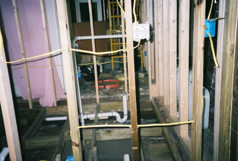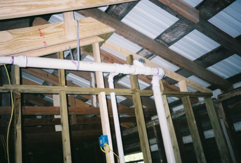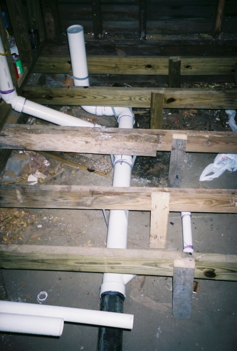 The job consisted of waste & vent plumbing for toilet, bathroom sink, tub, shower stall, washer in separate utility room, and the kitchen. Where the venting was to go through the roof, Kim cut the needed pieces and left those along with the vent caps for the roofer to cut holes and finish. All hookups were above floor joists and ready to cut after laying of floor, and placing of the items. We left a 2 page list recapping the next steps, including recommendations on how to proceed with the water hook-up.